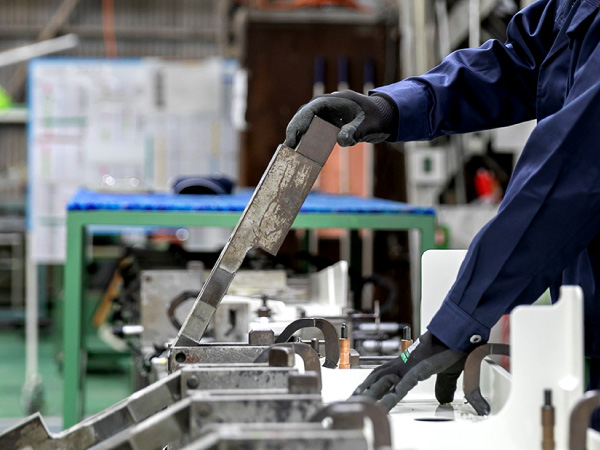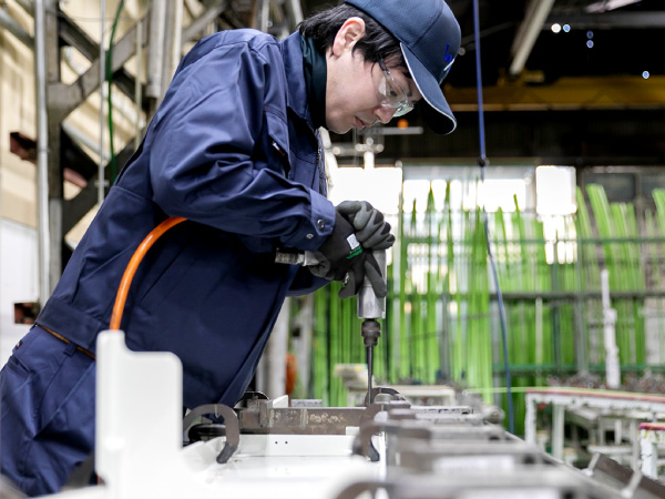 穿孔した孔にリベット、ボルト・ナットを使用し、工具及び専用設備を使用し締結して組み立てを行います。