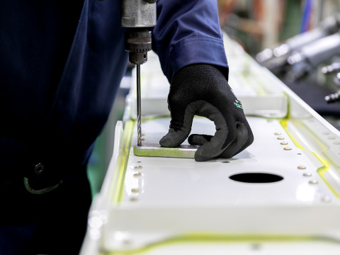 材料は主にアルミニウム合金を使用して、治具に部品をセット、工具・設備を使用して穴あけ・打鋲・ボルト/ナット締めを行い、製品へと組み立てます。