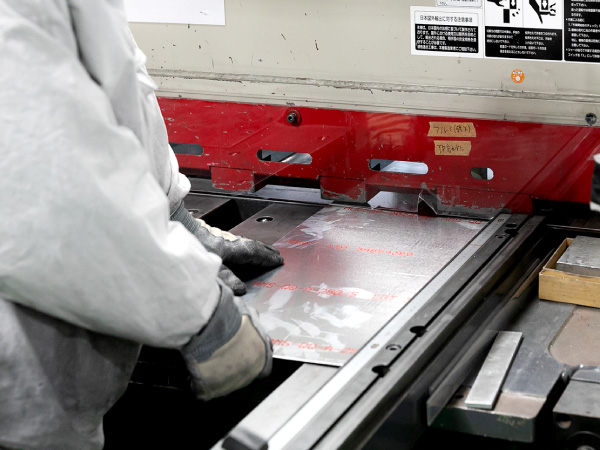 切断された材料をNC機械にセットして操作することによって、外形及び穴あけ加工を行います。加工部品にはバリトリ及び仕上げ作業を行います。