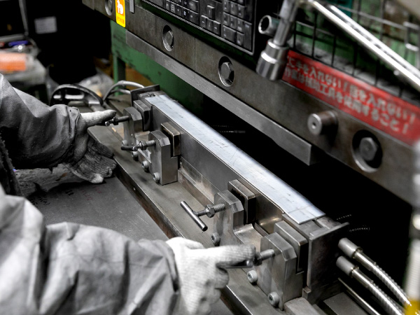 プレス機械に金型をセットして操作を行い、部品の折り曲げ及び成形を行います。