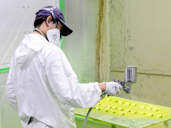 加工された部品を専用カゴにセットして、自動化された表面処理設備を操作して、防食性を高めるために部品の表面にコーティングを施します。表面処理された部品を専用の塗装ブース内にて、塗装ガンを使用して手作業にて部品に塗料を塗布します。