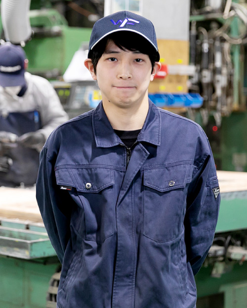 私がウイングフィールドに入社した理由は、航空機製造業に興味があり、工業高校で学んだ機械加工の知識が活かせると思ったからです。入社後は、部品課でNC工作機械などを使って金属を切削加工し、部品を作っています。新卒未経験での入社でしたので、最初はわからないことだらけで、この会社で戦力になっていけるか心配でしたが、先輩方から丁寧に指導していただいたおかげで、複数の機械を扱えるようになりました。今では新しい部品を加工する際、効率良く作業する方法を考え、生産効率を上げることにやりがいを感じるほどまで成長できています。